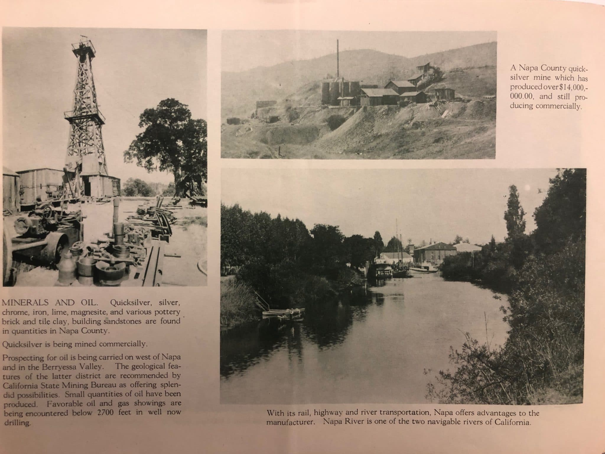 Page from Beautiful Napa showing a quicksilver mine, boats on the Napa River, and possibly an oil rig.