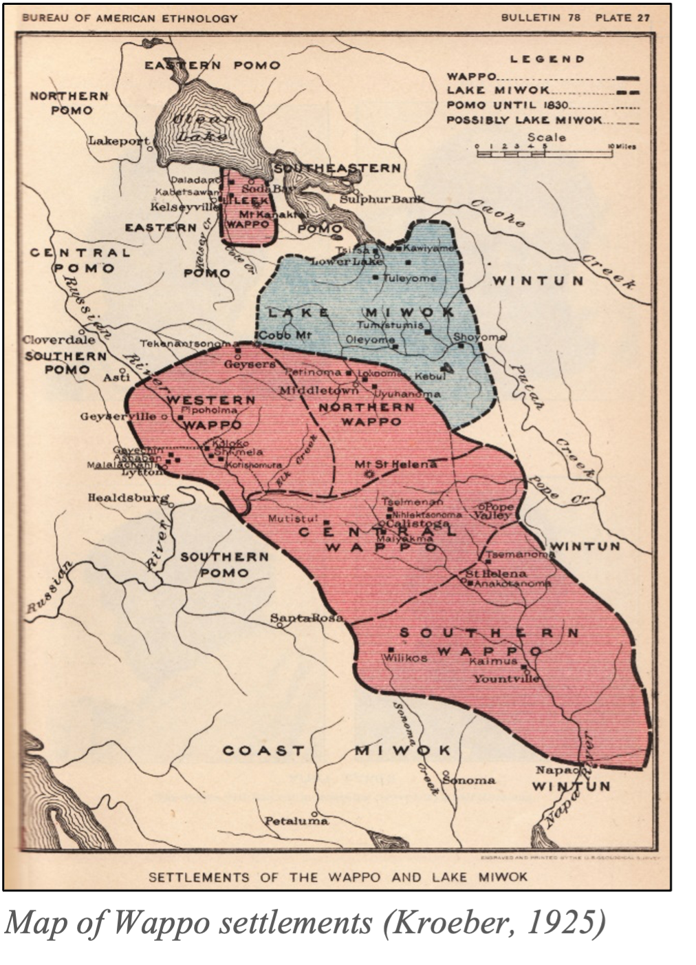 The first settlers came to Napa County about 10,000-12,000 years ago. The Southern Patwin, so-called for their word pat-win, meaning “people," were a southern branch of the Wintun (or Wintu) that occupied most of the land around Suisun, Vacaville, and Putah Creek. [1] Named for the Americanized version of the Spanish word guapo in reference to their brave resistance against the Mexican conquest, the Wappo lived throughout the Sonoma and Napa Valleys.[2] The Wappo spoke a unique dialect of the Yukian language, a group they split off from about 500 or so years prior to white contact. Like the Patwin, the Wappo were hunter-gatherers, consuming local seafood, deer, rabbit, fowl, acorns, and roots. They were famed for their basket-making. “Wappo villages were led by a chief, male or female, who was chosen for life. The villages were usually located along creeks, and were composed of oval grass-thatched houses... [They] were generally very peaceful, except for occasional warfare with the Pomo and struggles against Spanish incursions in the Napa Valley.”[3] The Patwin spoke a dialect of the Penutian language family. Like the Wappo, Patwin men generally wore no clothing and women typically an apron or skirt of shredded bark, tule, or animal skin. “There were numerous Patwin tribelets, consisting usually of a village with several satellite villages...dwellings, sweathouses and dance houses were all semi-subterranean, earth-covered structures.”[4] Many places in Napa County derive their names from Native American words. Suskol and Tulukai were Patwin villages near the Napa River. Suskol became Soscol, and Cayetano Juarez named his rancho Tulucay which Americanos later converted to “Tulocay.” The Wappo villages of Kaimus became George Yount’s Rancho Caymus and the Maiya’kma became Serro de los Mallacomes or the Mayacamas Mountains on the western side of the county. Even the word “Napa” may have come from the Napatos Patwin village. Dr. Edward Bale, who owned Rancho Carne Humana in the upper valley, may have given his land grant that name as a pun on his profession because it translates to “Ranch of Human Flesh.” However, there are two other possible origin theories: it might have referred to the erroneous belief that the local Wappo were cannibals; or it might have been a failed attempt by Bale to write down the pronunciation of the name of the nearby Wappo settlement Colijomanoc or Callajomanas. Anthropologist Alfred L. Kroeber estimated that prior to the incursion of white settlers there may have been nearly 1,000 Wappo in the Napa Valley and more than 12,000 Wintu state-wide. By 1843 there were fewer than 3,000 Wappo and Patwin combined in Napa County, though in 1851 there were nearly 8,000 Wappo throughout Northern California. By the 1970s it was believed that there were only about 50 Wappo left in California.[5] Kroeber reported that there were 22-150 Patwin left in California in 1924, although none were believed to be Southern Patwin; it is unknown how many Southern Patwin are around today.[6] Today the Mishewal Wappo Tribe of Alexander Valley has over 300 members and is the last extant band of Wappo in the area. Most of the 2,500 Wintun now live on rancherias in the North Central Valley.